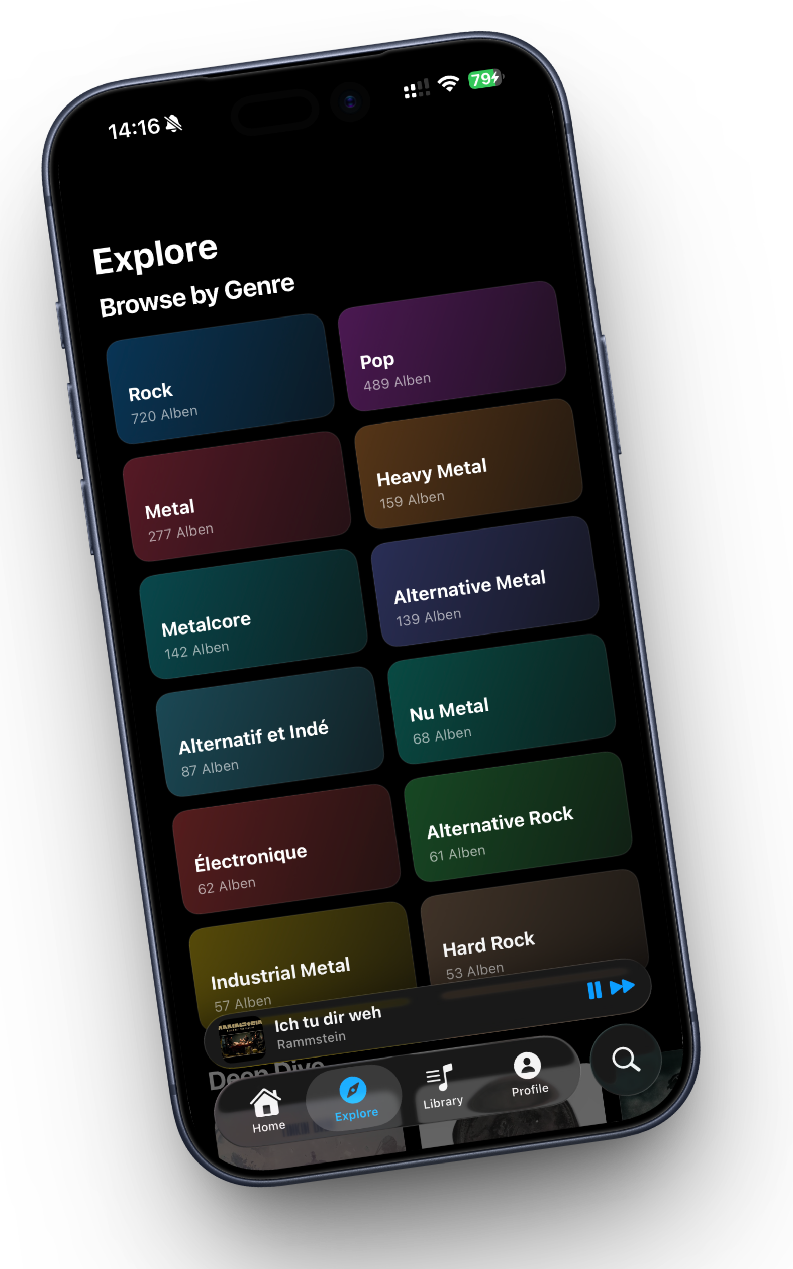 Ein Genre, eine Farbe. Rock blau, Metal gold, Electronique türkis. Album-Anzahl steht direkt drauf. Tipp drauf — und du bist mittendrin.