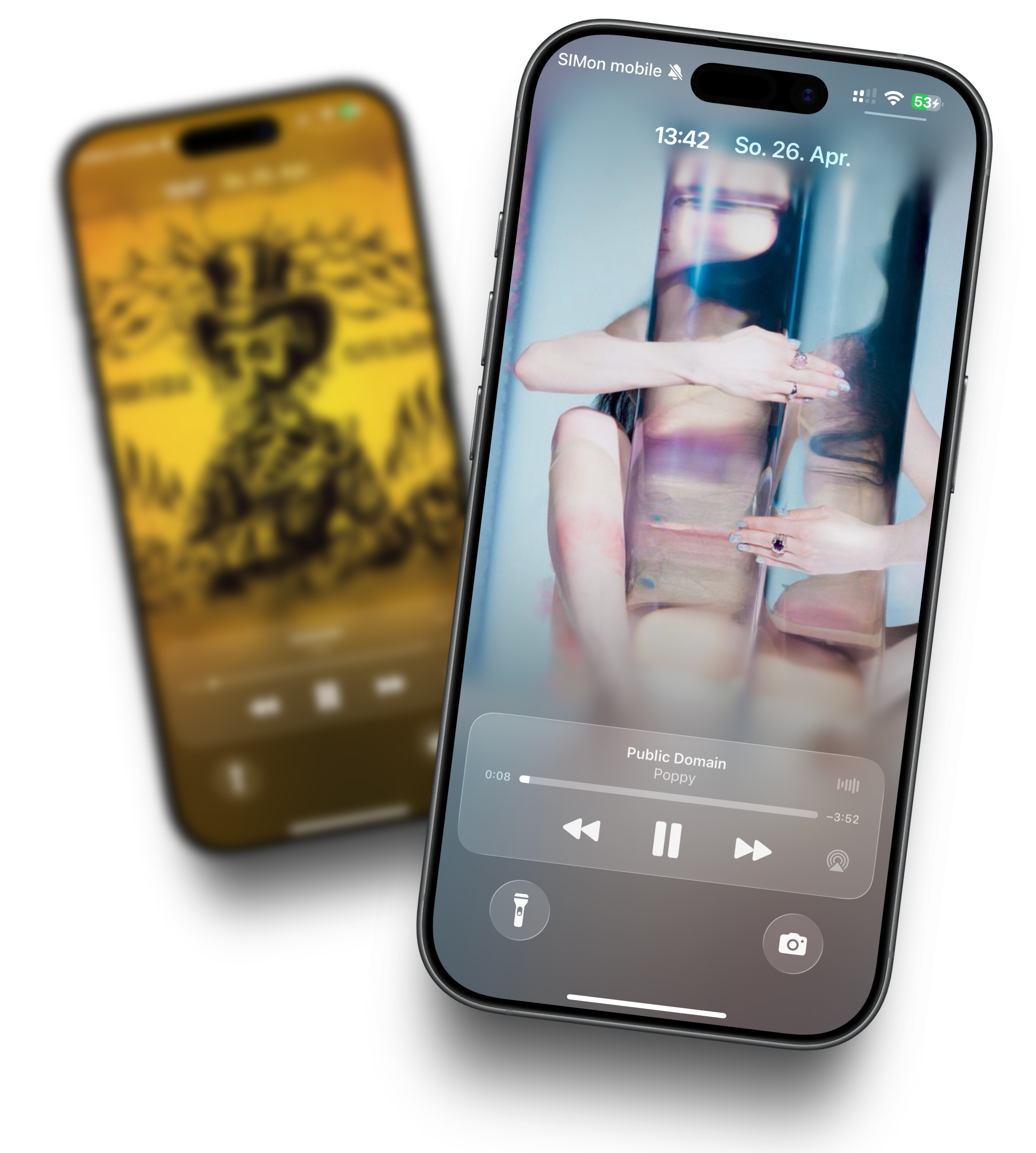 Sobald ein neuer Track läuft, taucht das Künstlerfoto vollflächig auf deinem Sperrbildschirm auf. Sanft animiert, im Stil des aktuellsten Apple-Designs. Du hebst das iPhone hoch und siehst nicht nur was läuft — du fühlst gleich die ganze Stimmung.